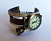 Montre au bracelet manchette composé de 3 beaux lacets de cuir de très belle qualité européenne : marron, naturel/beige et beige clair aux tâches dorées Le cadran est décoré d'un joli charme CLoche bronze doré.