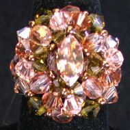 Une bague construite autour d'une navette en cristal Swarovski Golden (cristal doré) et montée avec des toupies de diverses tailles en 4 coloris dont la couleur Kaki, qui vient en constraste de la douceur des perles dorées et pêches.