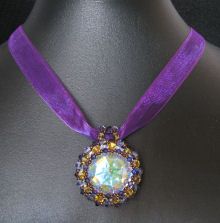 Le médaillon mesure 34 mm de diamètre, son cabochon est en coloris Crystal Ab qui réfléchit les couleurs, il est solidement serti par le montage de perles et tout à la fois cette sertissure laisse visible quasiment la totalité du cabochon en cristal.