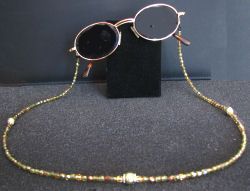 Un bijou élégant et pratique : un cordon pour lunettes en perles de cristal à facettes de la belle couleur Olivine Poudré AB, associées à des facettes en cristal Cognac et cristal or et à des perles nacrée Swarovski 8mm.