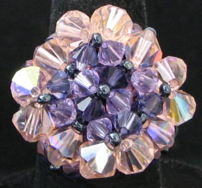 Une forme ronde pour cette bague de belle taille (24mm de diamètre) qui réunit des toupies Swarovski moyennes et grandes en 4 coloris, sur lit de perles cristal à facettes.
