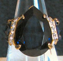 Une bague classique et très élégante : un gros cabochon "goutte", dans le nouveau coloris Swarovski : Dark indigo (un bleu nuit aux reflets bleu indigo), est encadré par des barrettes de strass, des toupies et des perles nacrées Swarovski également.