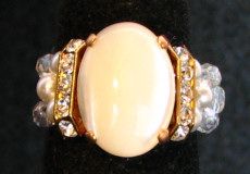 Une bague au cabochon ovale en nacre blanche encadré de barrettes de strass en cristal Swarovski , et de petites perles nacrées blanches Swarovski.