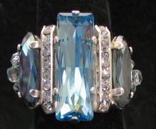 Cette bague aux composants Swarovski, de la série Balleny, est composée autour d'un grand cabochon Princess de couleur Aquamarine et de belle taille ( un rectangle de 21 mm de haut par 7 de large).