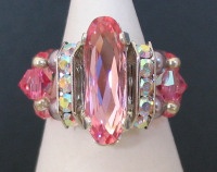 Elégante petite bague, facile à monter, qui tient tout son charme de l'association d'un cabochon Marquise long et fin rose clair et de barrettes de strass Swarovski Crystal Ab. Douceur des petites perles nacrées mauve Swarovski , anneau en petites facettes et rocailles.
