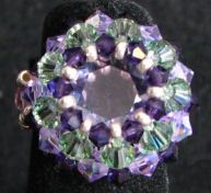 Douceur du cabochon carré Swarovski entièrement transparent et violet, encadré de toupies vert d'eau et de toupies en contraste, du beau violet foncé Purple Velvet.