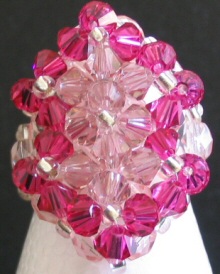 Une forme originale, pas tout à fait losange, des toupies Swarovski Cantaloupe qui changent de couleur selon la luminosité (violet clair à vert clair lumineux) encadrées de toupies fuchsia. Le kit comprend fournitures et notice détaillée avec schémas.