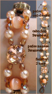 Un bracelet qui fait la part belle aux cabochons sertis Swarovski, encadrés de perles nacrées Swarovski, de perles Oeil-de-chat assorties, de facettes en deux couleurs ambrées.