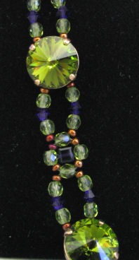Ce bracelet reprend l'harmonie de couleurs de la bague et du collier Shetland Olivine : association du vert olivine et du sombre violet Purple Velvet Swarovski, en contraste avec les sertissures et rocailles bronze dorées.