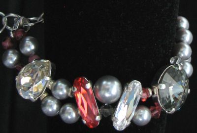 Deux cabochons Marquise, un cabochon Larme et un cabochon rond sont montés sur double rangs de toupies et perles nacrées en cristal Swarovski et facettes avec une chainette de larges anneaux argentés.
