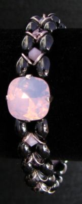 Un bracelet monté en maillage avec des perles en Hématite de forme olive, des anneaux argentés et des toupies Swarovski sur 3 tons entre Rose et Blanc opale qui met en valeur un sublime cabochon carré Rose water opal (une nouveauté Swarovski).
