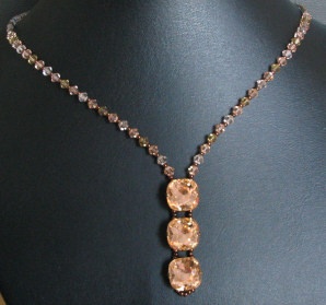 Harmonie de tons autour de la couleur pêche clair des cabochons en cristal Swarovski, avec des toupies (dont la couleur très claire Silk, la couleur lumineusre Crystal Golden shadow) ) et, pour la partie le long du coudes petites facettes en duo, bronze doré et rose pâle, douces au contact.
