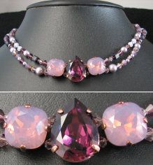 Un collier très Swarovski composé en son centre d'un cabochon Swarovski Amethyste en forme de gouttes (de 23 mm de haut), encadré de 2 cabochons carrés de la nouvelle couleur Swarovski "Cyclamen opal", un cristal ax doux reflets violet.