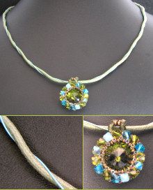 Le pendentif est à monter sur un cordon en coton vert olive épais sur lequel vient s'enrouler un fil cablé bleu/vert turquoise : le cordon est ainsi parfaitement assorti à son pendentif.