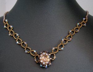 Le pendentif du collier est composé d'un cabochon ovale Swarovski de la douce couleur Vintage rose et de toupies en cristal Swarovski sur 3 tons et en 2 tailles dont la teinte lumineuse aux effets ab2x. De chaque côté du pendentif, des spirales en rocailles et petites toupies suspendent le pendentif de façon originale. Les rocailles sont "bronze doré", les apprêts bronze cuivré.